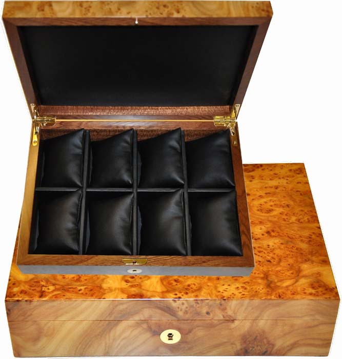 Coffret de luxe en loupe d'orme pour montres, 8 coussins