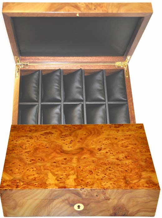 Coffret de luxe en loupe d'orme pour montres, 10 coussins